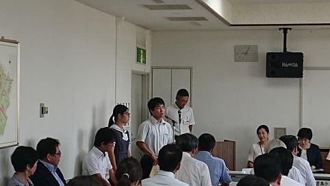 10月7日(月)、八代市の千丁町支所で10月定例校長・園長先生会議にて、泉支所と合同で矢山岳イベントのPR活動を行ってきました。100人近い大人の前で話すのはとても緊張したようでしたが、活動意義や自分たちの泉町に対する思いをしっかり話していました。