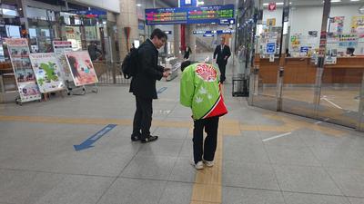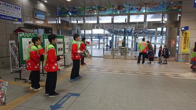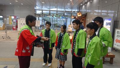 12月26日(木)に新八代駅で泉町の観光PRを行いました。泉町の季節の写真、泉分校の研究活動を展示しました。駅を利用される方には、パンフレットと桜の木で作った箸置きをプレゼントしました。普段は話かけるのが苦手な生徒も、頑張って話しかけていました!!1月14日まで新八代駅に展示してありますので是非見に行ってください!!