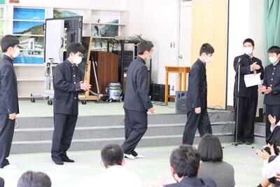 学科主任の挨拶の後、2・3年生からの歓迎の挨拶を、生徒会長の本吉くんが行いました
