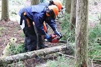 熊本県林業研究指導所から3名来ていただき、2年生対象にチェーンソー講習をおこないました。基本的なチェーンソーの操作方法の説明を受けた後、伐採を見学し、今回は玉切りに挑戦しました。お忙しい中、3名の講師の先生方ありがとうございました。