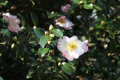泉分校の県道側斜面の坂(通称 V字坂)で、サザンカが咲き始めました✿