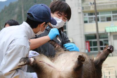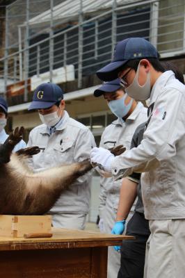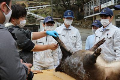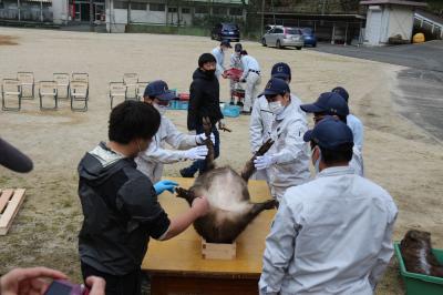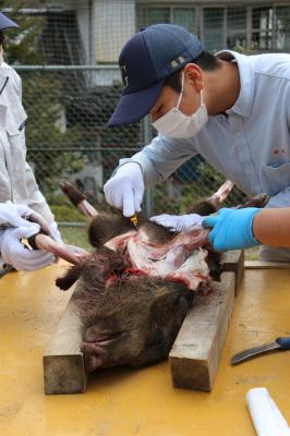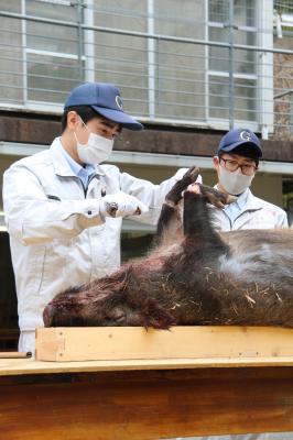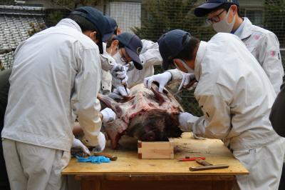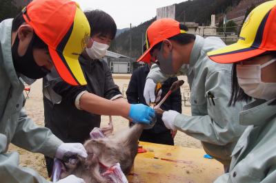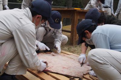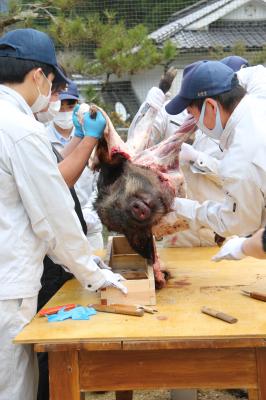 講師に株式会社イノPの井上拓哉様をお招きし、指導をしていただきました。夏休みに処理場でのシカの解体処理の見学はしたことがある生徒もいましたが、自分でイノシシやシカにナイフを入れて解体することは初めての経験でした!!最初はとても緊張していました。しかし、的確な指導のおかげで、最後まで、自分達の力で皮を剥ぐことができました