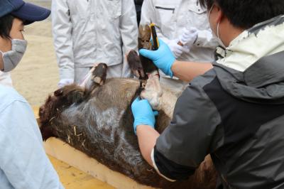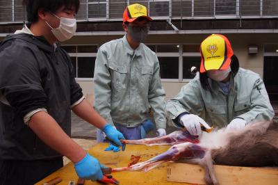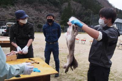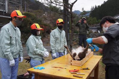 そこで、今回は解体後、処分されがちな皮の利用を目指し皮剥ぎ実習を行いました。