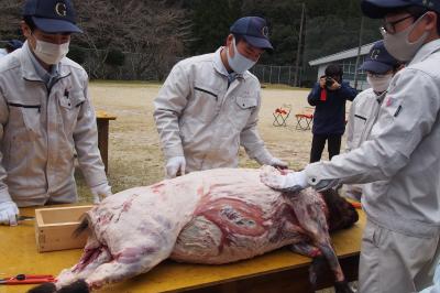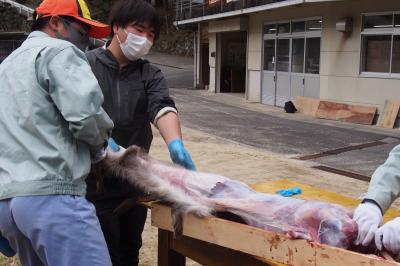 皮剥をしたイノシシやシカが映っています。苦手な方はご注意ください