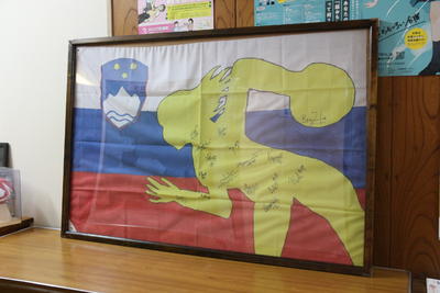 泉分校の廊下には、写真と共にサイン入りのボールが飾られています。