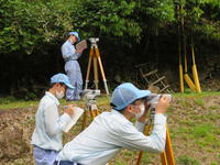3年生「森を守る」の授業で、水準測量を行いました。オートレベルを使い2点間の高低差を求める実習で、初めて測量機器を使い、生徒たちは苦労しながらも、なんとか時間内に測ることができました。