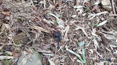 近くにこんな物がありました。イノシシの糞です。見た感じ乾燥しかけているようで、1週間ぐらい前に来たと思われます。タケノコを食べたのはイノシシのようです