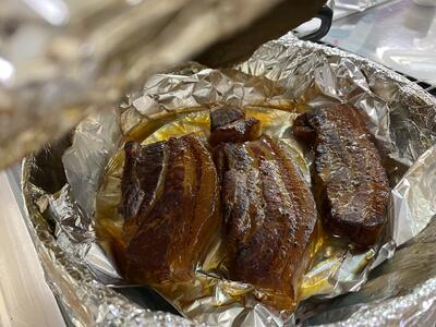 そして、30分程度加熱すると、表面が飴色に燻されたベーコンの出来上り!さっそく、味見をしてみると、市販のものとは違う、煙のにおいを存分に感じられる美味しいベーコンに興奮しました