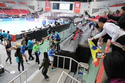 観戦が終了し選手退場。残念ながらスロベニア(Slovenija)は負けてしまい残念スロベニアの選手にお手製の応援旗をプレゼントできれば!!受け取ってくれた!!!