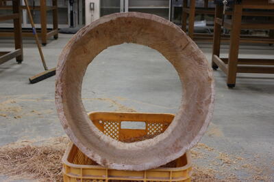 スギの木を加工し、胴を作製します。なかなか力加減が難しい作業のようでした