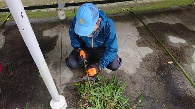 防除実験に取り組むためにカメラ周辺の草刈りを行いました。昨日、実習で勉強した刈払機を早速使ってみました。草丈も太もも付近まで伸びており、刈るのに苦労していたようです