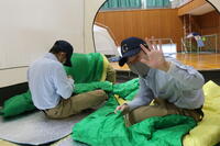 11月12日(金)にグリーライフ科1年生がキャンプ実習を行ないました。キャンプの初日、当初予定していたグラウンドでのキャンプは、地面が雨でぬかるんでいたため、急遽、体育館内にテントを張ることになりました。
