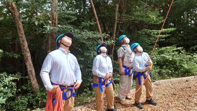 森のチャレンジコース2日目、午前中の研修が終わりました。ハイエレメントコースでの研修となり、生徒たちはワクワクとドキドキの半分だったようです。