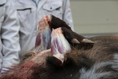 皮剥をしたイノシシやシカが映っています。苦手な方はご注意ください