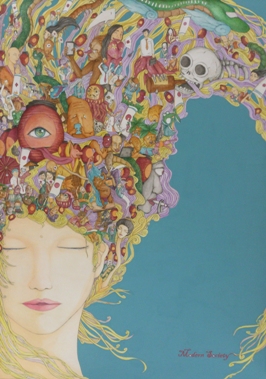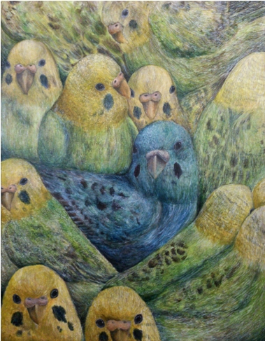 飼っているインコをもとに描きました。中央のインコは周りと少し違います。美しい?醜い?あなたにはどう映りますか?