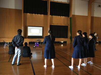 熊本県商工労働部企業立地課の本田様より県内企業の情報や、県内、県外に就職するにあたっての判断方法などを生徒たちに伝えていただきました。