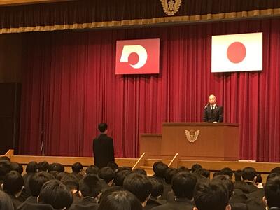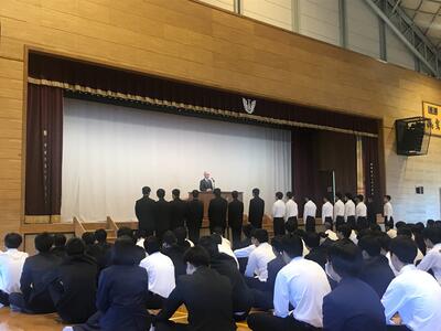 続いて行われた激励会では、全国高等学校総合体育大会 弓道競技大会(第70回記念全国高等学校弓道大会)に男子団体で出場する生徒にエールが送られました