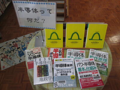 いろいろなところで何かと話題の「半導体」。でも、よく分からない…という人のために色々な本を展示しています。ぜひ一度手にとってみてください~。