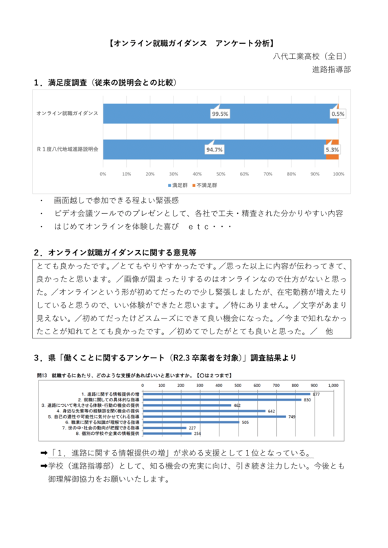 そんななか、5月の休校期間における生徒・保護者のアンケートから進路に対する御心配が少なくないことが分かり、その思いを緩和・解消できないかと考え、3年生と参加希望の2年生ならびにその保護者を対象に、(一社)八代圏域雇用促進センターとのタイアップのもと、教室を会場にしたオンラインのガイダンスを実施いたしました。