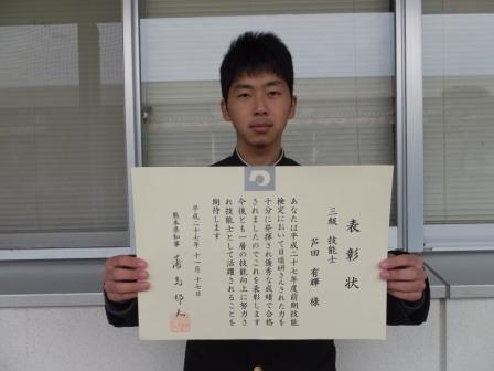 今回優秀技能士とした賞状をいただけたのは、日々の練習から自分が納得するまでこだわり続けたからだと思います。今回の経験を他のことにも活かしていきたいです。(髙野くん 千丁中出身)