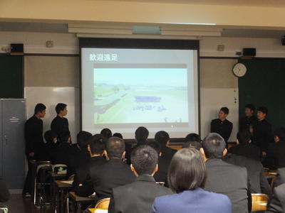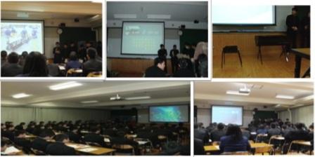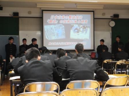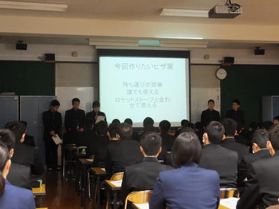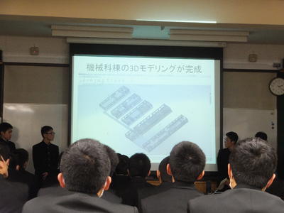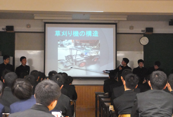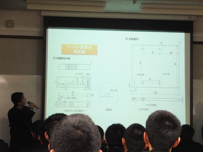 機械科は2クラスあるので、1/15(金)に機械科3年B組が2年B組の生徒へ、1/26(火)に機械科3年A組が2年B組の生徒へ成果を発表しました。