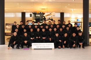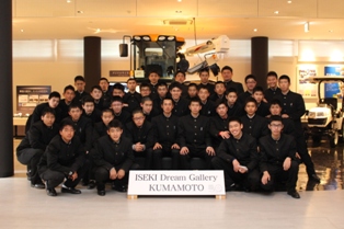 次に昼休憩を挟んで、上益城郡益城町にある井関熊本製造所(以下、井関)に行きました。ここでは最初に、井関の歴史や歴代最強と呼ばれているコンバインHJ6123(通称Japan)が展示してあるISEKI Dream Galleryで写真撮影を行いました。次に会社説明を聞いたのですが、最近は「農業女子プロジェクト」という名で、女性にも積極的に農業に参加してもらいたいということで、クッション性を高くしたシートや大きな日よけをつけたりしたトラクタ(通称しろプチ)を生産しているといった情報を聞くことができました。また、工場見学では鋼板がプレスされて所要の形になったり、溶接などを経て農機が完成する様子を見学できました。