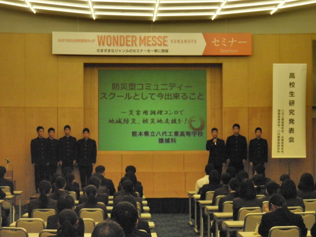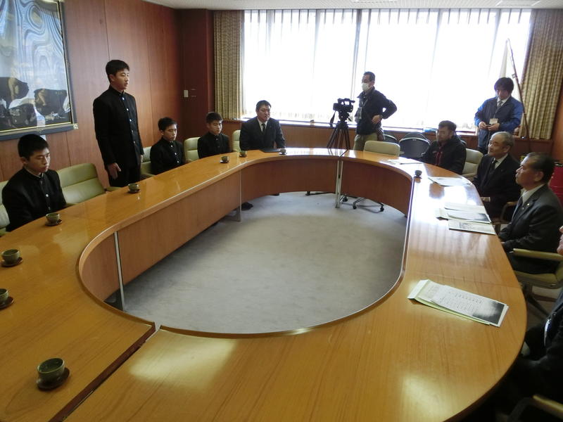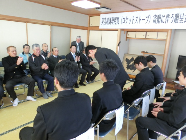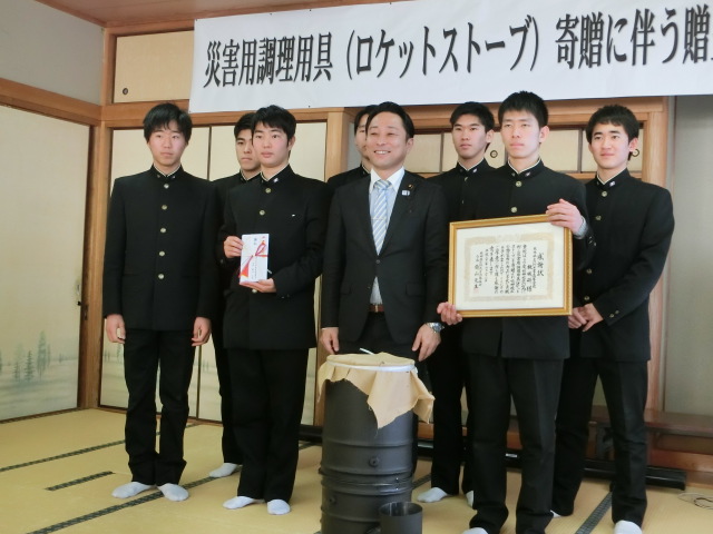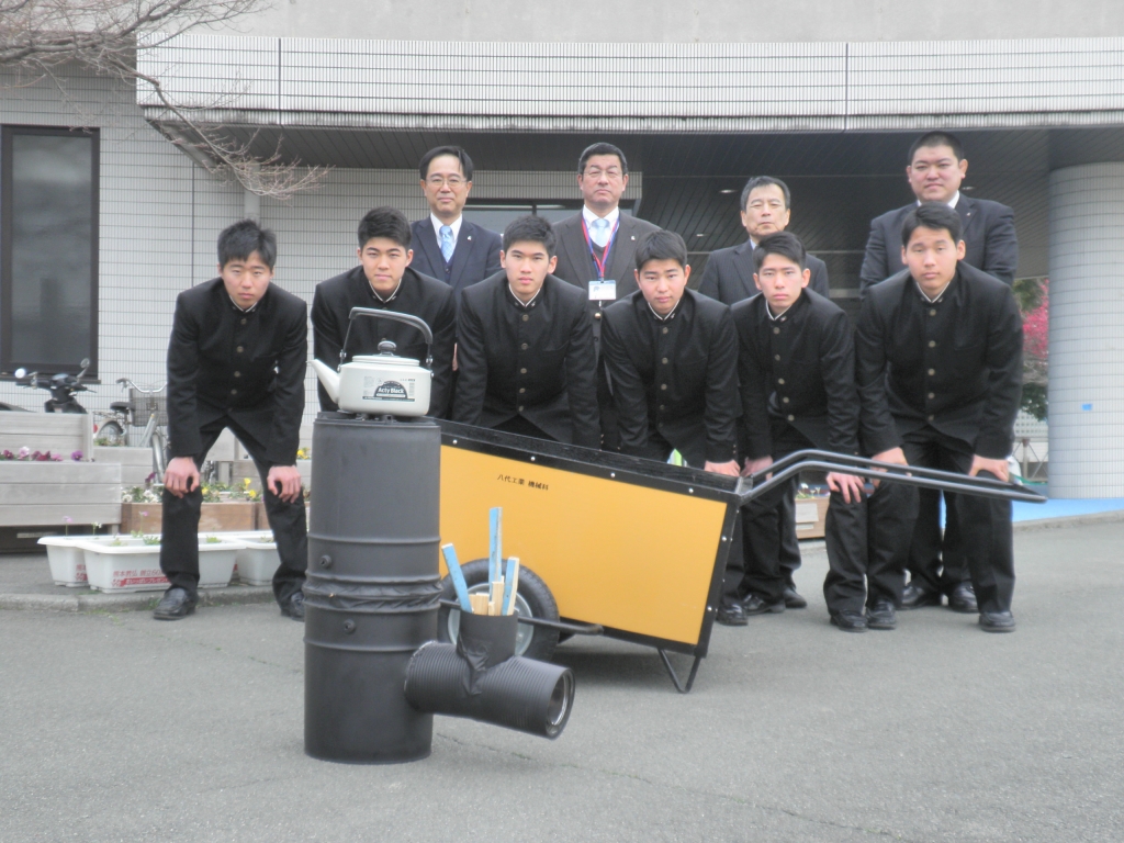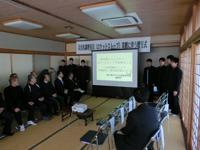 当日は本校機械科3年生の生徒ら9名で訪問し、中村八代市長、八代市社会福祉協議会の沢邑事務局長、八代青年会議所の綿田様らとの懇談後、ロケットストーブを贈呈しました。卒業する3年生にとって、良い思い出になりました。