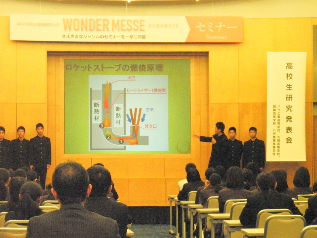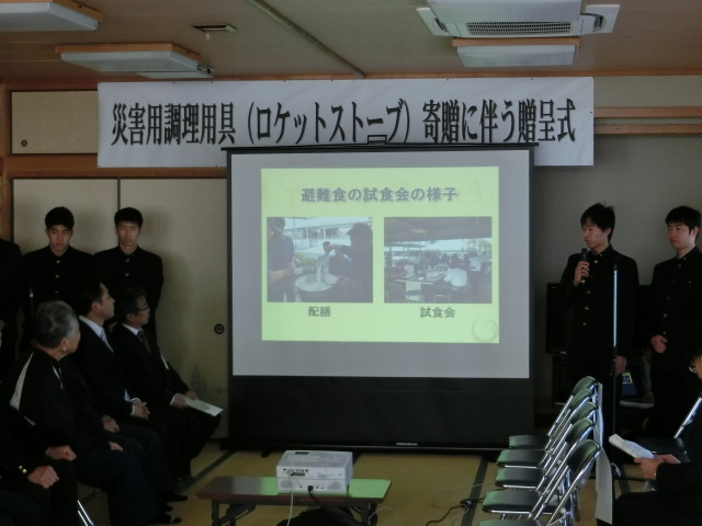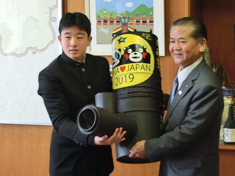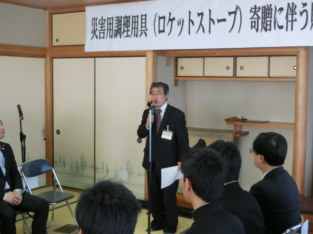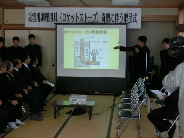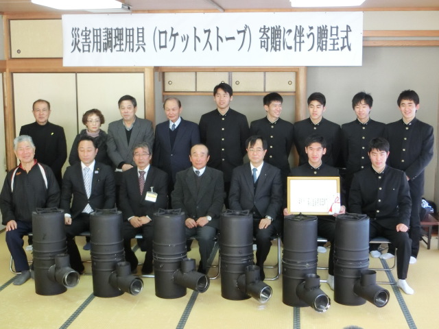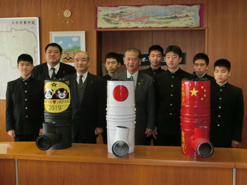 2月25日(火曜日)10時00分より、八代市社会福祉協議会の会長である中村博生八代市長に、令和元年11月に本校機械科3年生の課題研究「地域貢献」班6名と中国高校生訪日団34名がものづくり交流で一緒に製作したロケットストーブを贈呈しました。