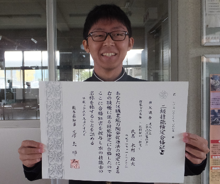 機械科2年生の吉﨑くん(千丁中出身)が難関の甲種に合格しました