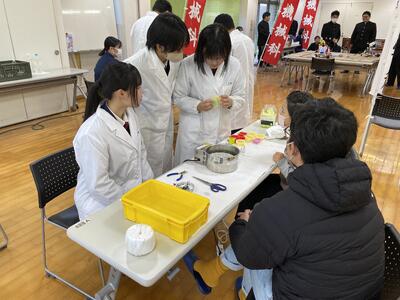 私たち工業化学科の生徒は出前授業をとおして、プレゼンテーション力やコミュニケーション力など多くのことを学ぶことができましたし、課題研究で得た知識を活かすことのできる貴重な機会となりました。小学生も高校生も、大人もみんな笑顔であふれた授業時間となりました。