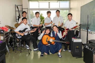 軽音楽部は、月、水、木、金の週4日(R5年度)活動をしています。文科系部活動では、人数も多く、部活動に意欲的な生徒ばかりです。大会等の出場はありませんが、文化祭での発表や外部からの依頼があれば参加することもあります。人数が多いので、学校で準備できる楽器等の数が少なく、できるだけ個人で必要な楽器を購入していただければ練習もスムーズにできると思います。