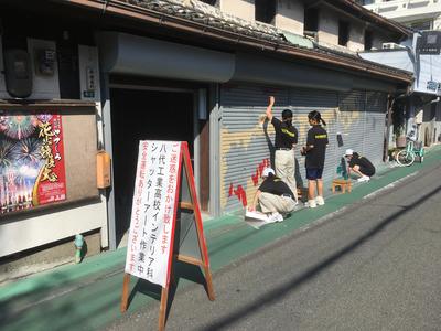 今年の3年生による課題研究「グラフィックデザイン班」の4人で、現在妙見祭の獅子組(獅子連中)の鬢付け小屋のシャッターアートに取り組んでいます。