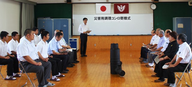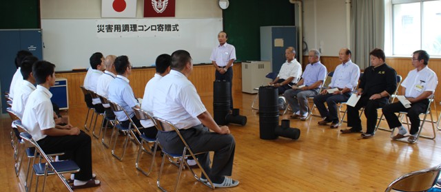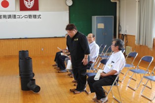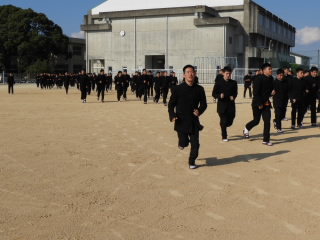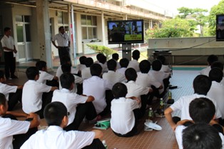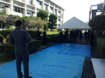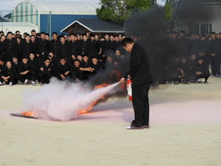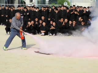 最初に、大規模な地震が発生したという想定で熊本シェイクアウト訓練(まず低く、頭を守り、動かさない)を行い、その後、地震による火災が発生したため、グラウンドに避難する訓練をしました。生徒たちは一つひとつの訓練を真剣に取り組み、避難の放送から6分10秒でグラウンドに集合することができました。その後、学校運営協議会の方の自己紹介、(株)ホリタシステムの森下様による消火器の取り扱い指導をしていただきました。