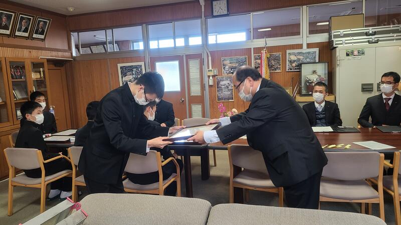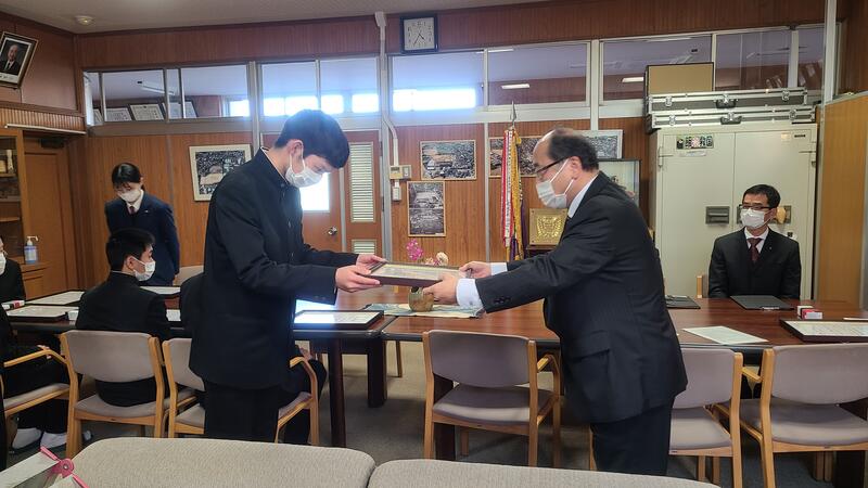 4月5日(火)に(株)アライカーボン様の『ひぎんSDGs私募債』による本校工業化学科への寄付の贈呈式が行われました。式には(株)アライカーボン代表取締役 荒井様、(株)肥後銀行八代支店長 田中様等がご出席され、本校の村木校長に目録の贈呈が行われました。