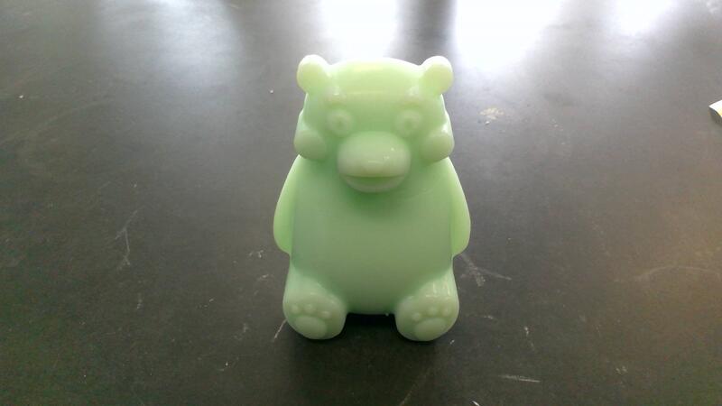 くまモン蓄光キーホルダーは、60度の湯煎で柔らかくなるプラスチック、に蓄光パウダーを混ぜ込み作成しています光にしばらく当てておくと、暗闇で光りますよ