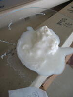 納豆のネバネバ成分を薬品を用いて抽出しました。右の白いお餅みたいなものがネバネバ成分です。