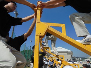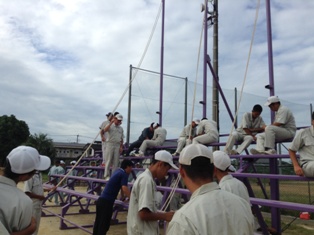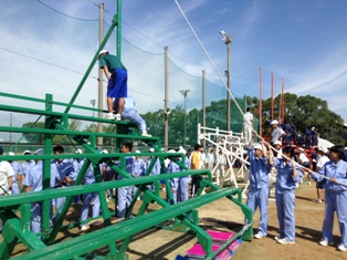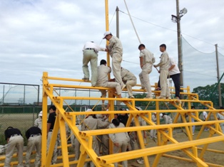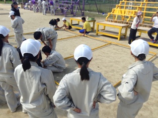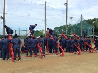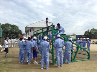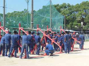 インテリア科職員室の近くにある鉄棒で蹴上がりの授業が行われていました。