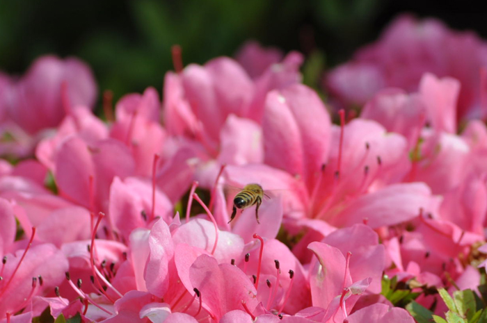 教室棟前のサツキでみつばちが蜜を集めていました。