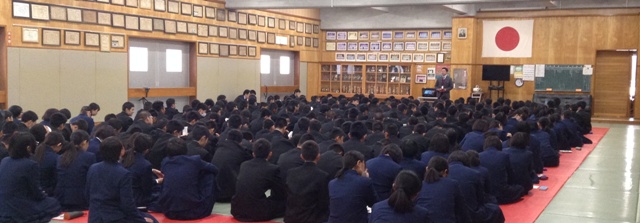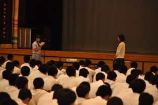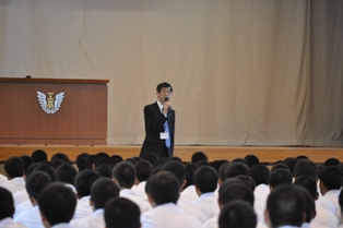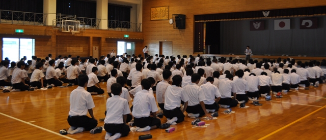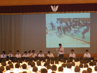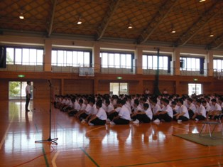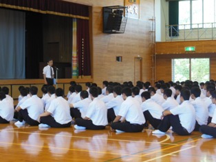 テスト終了後1年生の集会が行われ、交通安全や修学旅行についてのお話がありました。