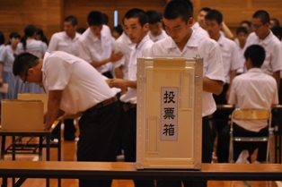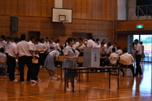 本日は選挙年齢引き下げにともない、新たな有権者となる3年生を対象に、本物の投票箱を使っての模擬投票が行われました!