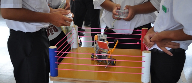 本校から参加している情報技術科2年の鶴島君はビュートレーサーという、黒色のラインを走る車のプログラムを作成し、その成果を英語で発表する予定です。