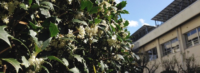 教室棟前の柊(ひいらぎ)が目立たず控え目ですが白い花を咲かせており、とても良い香りを漂わせています。