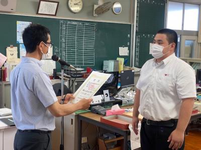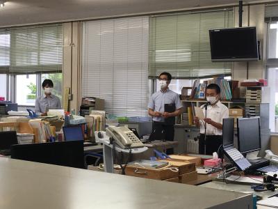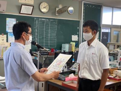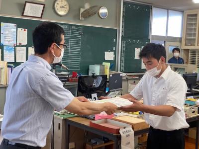 7月16日(金)九州リハビリテーション学院から、志垣理事長、田爪副理事長、志垣専務理事、島田事務次長が御来校され、マスク、消毒液等の寄付を頂きました。