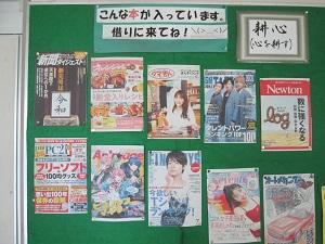 売店前には図書館で読める雑誌を紹介しています。図書館へもぜひどうぞ!