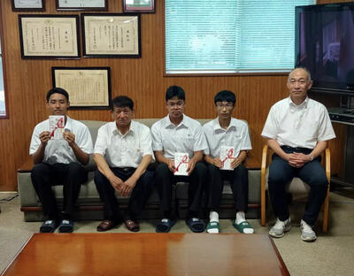 本日、本校校長室にて、「令和5年度 専門高校生グローバルチャレンジ事業」に派遣が決定しました3名の生徒へ、本校同窓会会長 原 登志雄 様から支援金の贈呈が行われました。