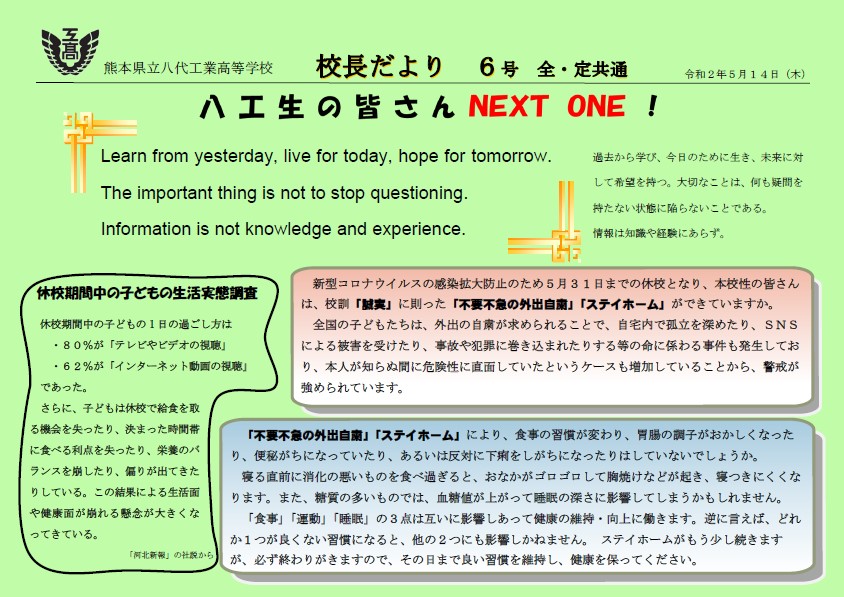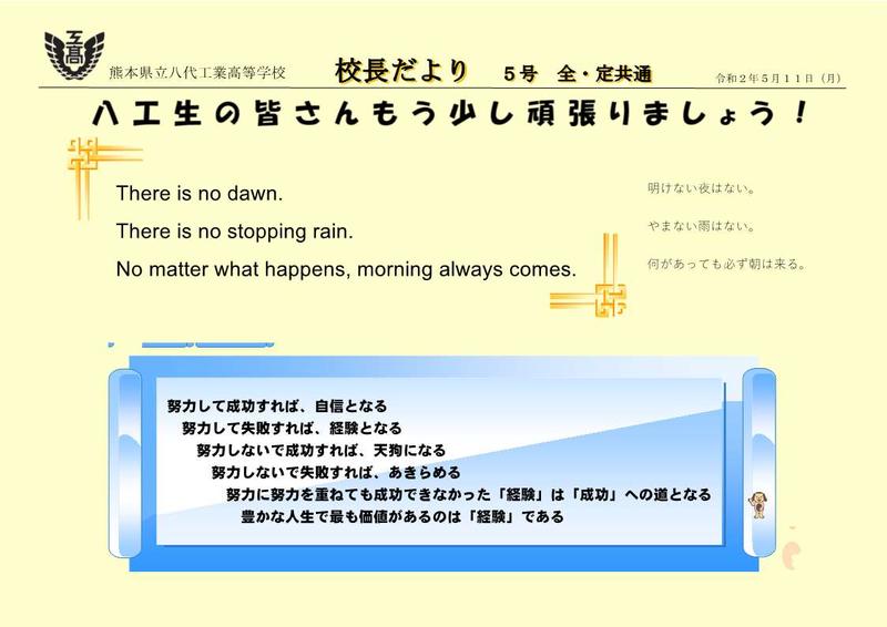 県立高等学校・中学校の再開について、新聞・TV等で報道がありましたところですが、本校定時制においては以下に示す内容で、段階的に教育活動を再開していきます。詳細は、18日(月)の登校時に連絡します。