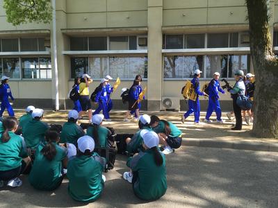 出発前にインテリア科棟前で応援歌と校歌の練習