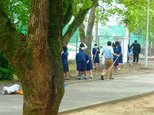 昨日は春の嵐が吹き荒れ、外庭掃除は大量の落ち葉と戦いました!おかげさまで新任の先生方もきれいな渡り廊下で体育館に向かわれました。