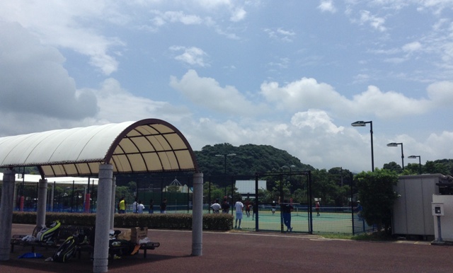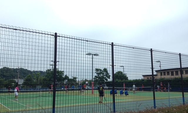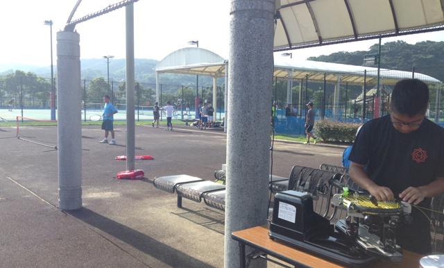 2日目もいい天気。合宿にはガット張り器も持っていきます。