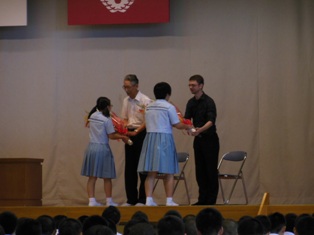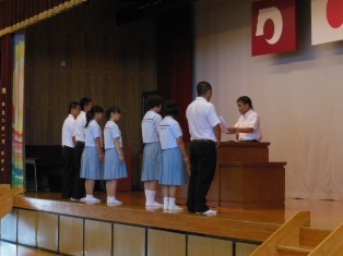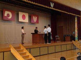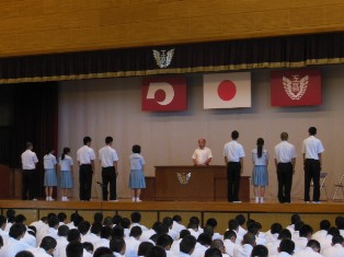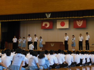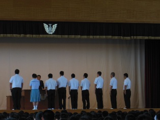 本日は終業式の前に国語科の松久保先生とクリストファースマイルズ先生の退任式、表彰式、推戴式が行われました。